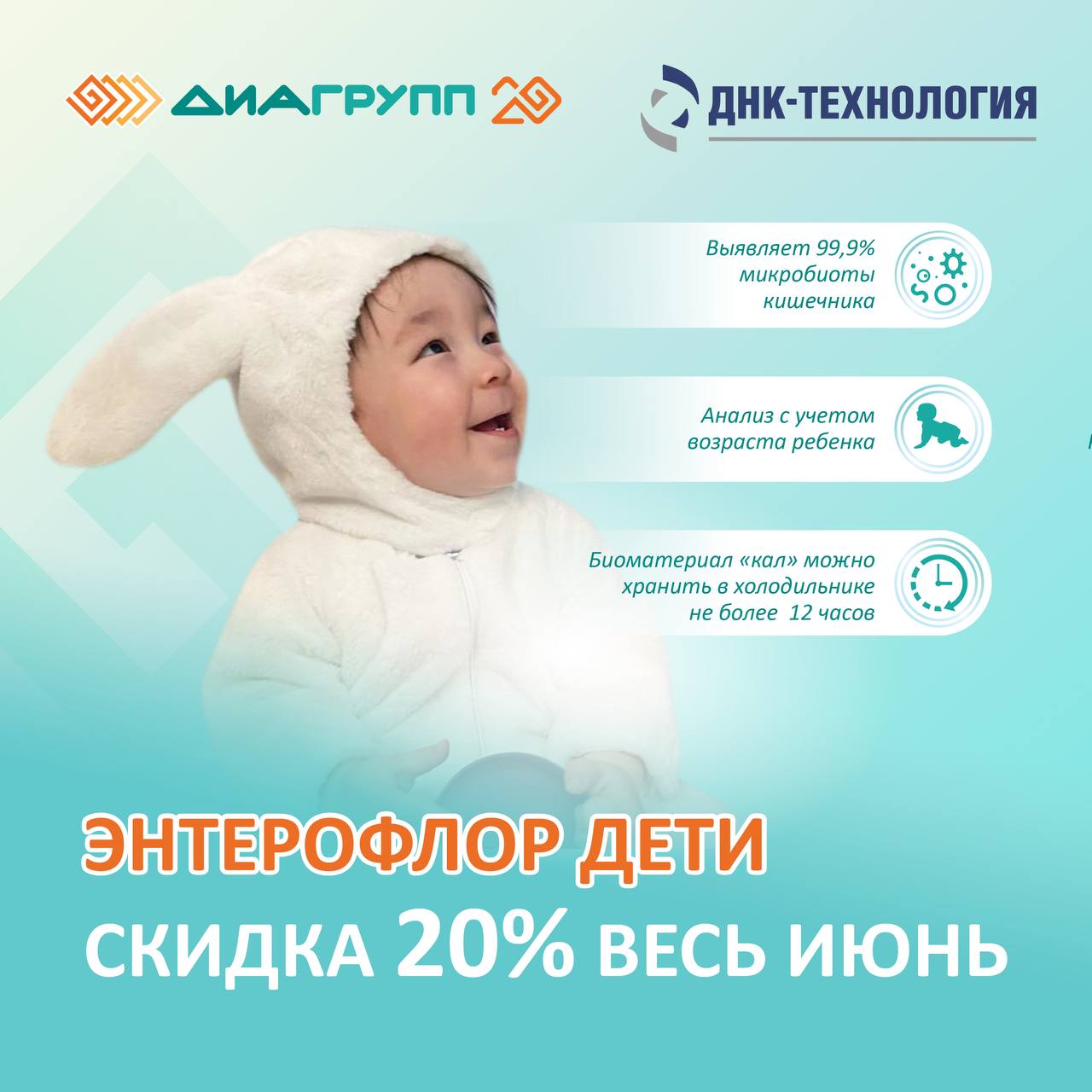 🎁В ИЮНЕ скидка 20% на ПЦР-тест «ЭНТЕРОФЛОР Дети» для анализа микробиоты кишечника у детей от 0 до 14 лет!